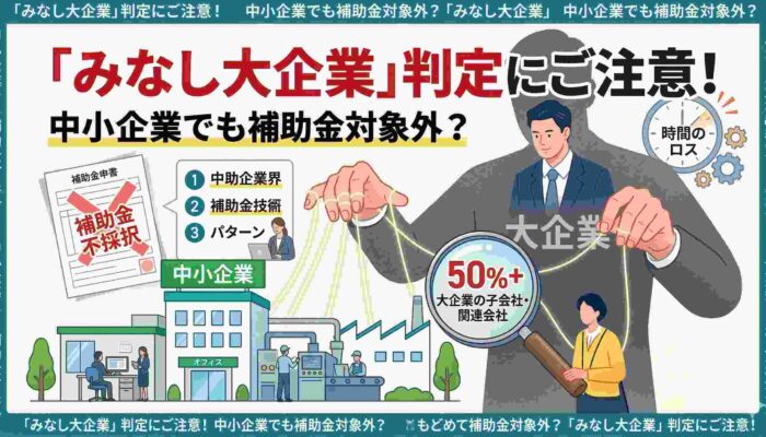 申請書類を全部仕上げた後で発覚すると、取り返しのつかない時間のロスになります。この記事では、みなし大企業の定義・判定基準・よくある誤解まで、わかりやすく解説します。